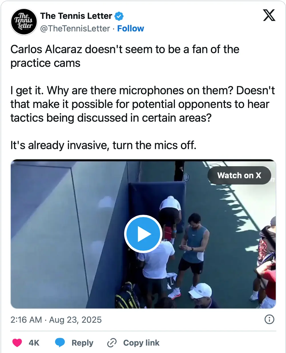 账号“The Tennis Letter”在社交平台上发布了阿尔卡拉斯训练时的视频,并配文表示:“阿尔卡拉斯显然不喜欢这些训练摄像头,我理解。为什么上面还要装麦克风?这不是意味着潜在对手可能偷听到战术讨论吗?这已经够侵犯隐私了,把麦克风关掉吧。”